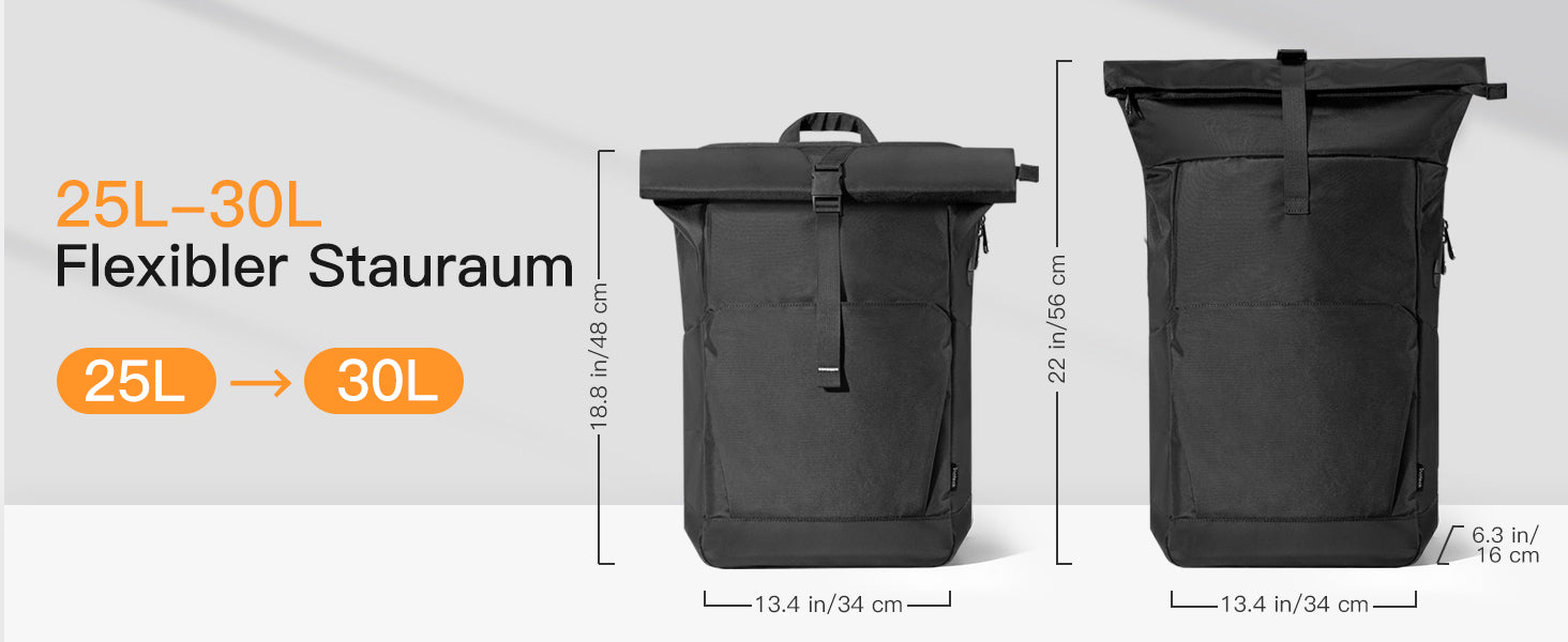 - Flexible Kapazität: Aufrollbare Abmessungen: 48cm*34cm*16cm, Erweiterte Abmessungen: 56cm*34cm*16cm. Mit 25L-30L variabler Kapazität kann das Hauptfach aufgerollt und mit Gurtband und Schnallen gesichert werden, um das Rucksackvolumen zu reduzieren, wenn Sie wenig Gegenstände haben. Bei zu viel Inhalt können Sie den oberen Reißverschluss als Schließhilfe verwenden, um die Kapazität zu erweitern.
