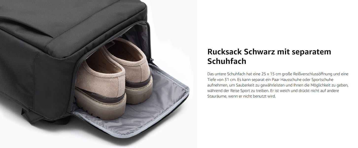 - Separates Schuhfach: Das untere Schuhfach hat eine 25 x 15 cm große Reißverschlussöffnung und eine Tiefe von 31 cm. Es kann separat ein Paar Hausschuhe oder Sportschuhe aufnehmen, um Sauberkeit zu gewährleisten und Ihnen die Möglichkeit zu geben, während der Reise Sport zu treiben. Er ist weich und drückt nicht auf andere Stauräume, wenn er nicht benutzt wird.