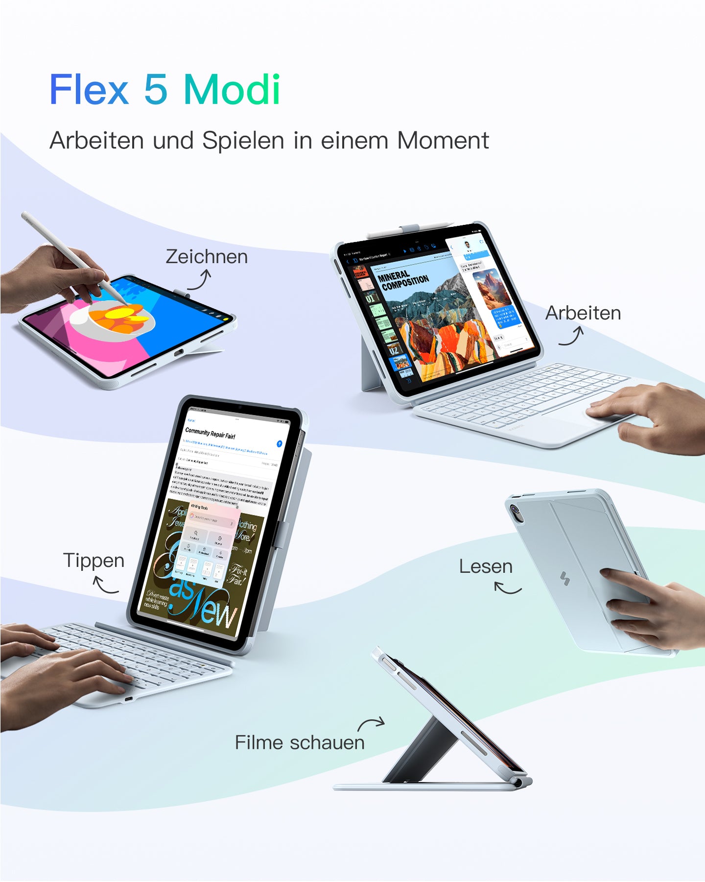 - Sowohl ein iPad als auch ein Notebook: Tastatur und Schutzhülle sind magnetisch verbunden und lassen sich in nur 1 Sekunde einfach abnehmen. Auch mit einer einzigen Hülle genießen Sie stabilen Halt. Sie kann horizontal oder vertikal aufgestellt werden und bietet so mehr Möglichkeiten für verschiedene Szenarien wie Arbeiten, Lernen, Filme schauen, Zeichnen, Lesen usw