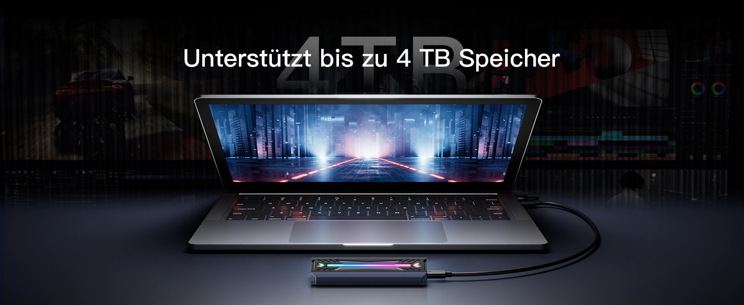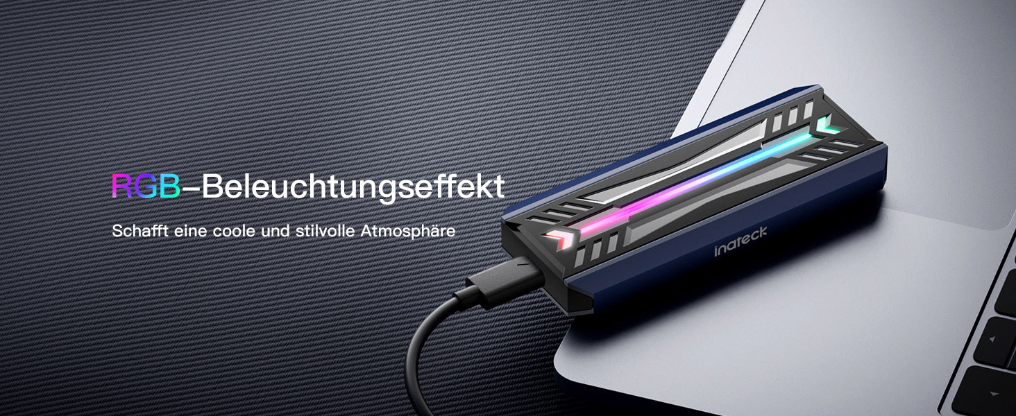 - RGB-Beleuchtungseffekte: Dieses 10 Gbps M.2 NVMe SSD-Gehäuse ist mit einem RGB-Lichtstreifen ausgestattet, der beim Anschluss blinkt und ein cooles visuelles Erlebnis bietet. Zusätzlich verfügt es über eine blaue Kontrollleuchte, die den Datenübertragungsstatus anzeigt (leuchtet dauerhaft bei Verbindung und blinkt während der Datenübertragung), was die Nutzung einfach und klar macht.