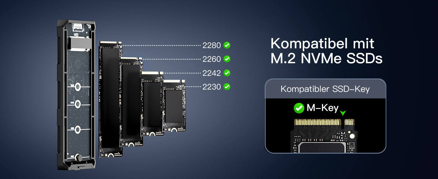 - Breite Kompatibilität: Dieses Gehäuse ist für M.2 SSDs mit NVMe PCIe- und SATA M-Key / B+M Key-Schnittstellen geeignet. Es unterstützt mehrere Größen von SSDs, einschließlich 2230, 2242, 2260 und 2280. Hinweis: Es unterstützt keine M.2 PCIe AHCI SSDs, M.2 PCIe-Geräte, mSATA SSDs oder nicht-M.2 SSDs. NVMe- und SATA-SSDs sind nicht enthalten.